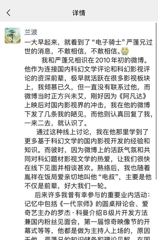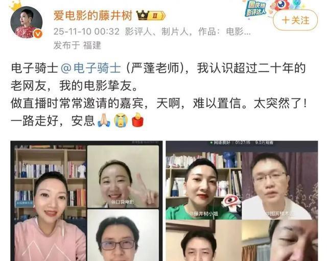 11月10日凌晨创赢盘,多位影视编剧导演发文悼念知名影评人严蓬。有消息称,严蓬(网名“电子骑士”)于昨晚去世。